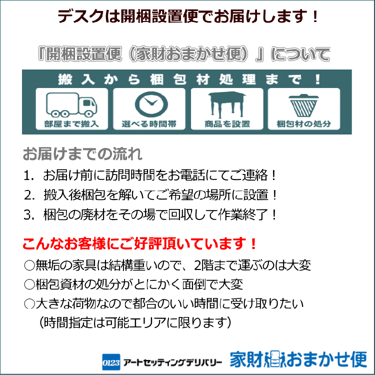 できるだけ安全かつお得にお届けできますよう、「デスクはアートセッティングデリバリー・家財おまかせ便(旧ヤマトホームコンビニエンス・らくらく家財宅急便)」「チェアは宅配便」にて、できるだけ同じ時間帯にお届けできますよう発送致します。